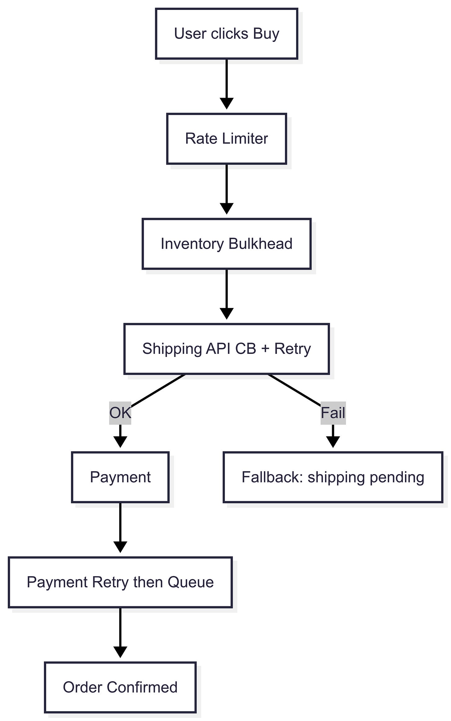 Circuit breaker + retry: Protect shipping API, fallback to "shipping pending"